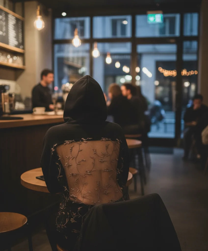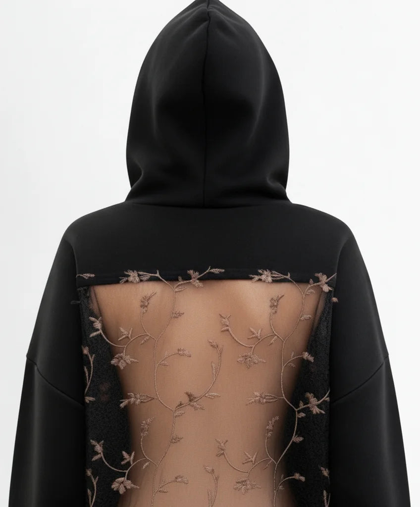 It's the daring fusion of cozy comfort and the exquisite, intricately embroidered sheer panel that truly sets it apart. This isn't just a garment; it's a canvas for your unique expression, designed to make you blossom with every wear. A captivating allure, effortlessly chic.